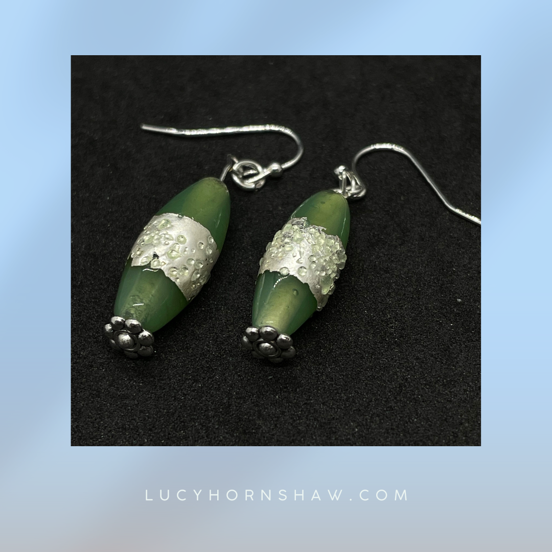 Green glass with silver detail drop earrings